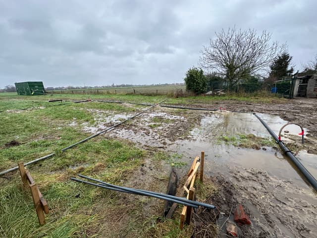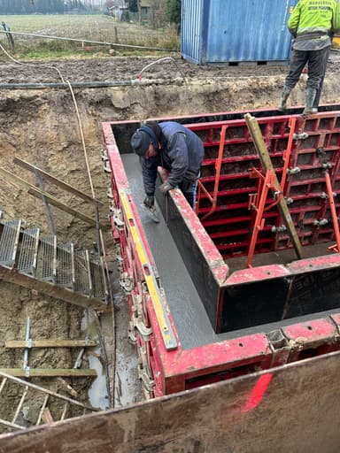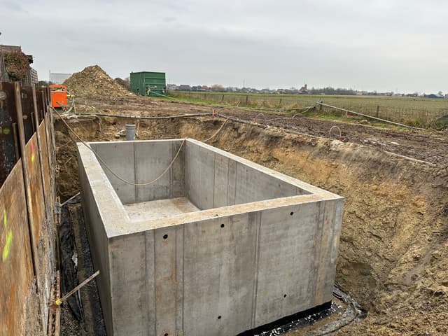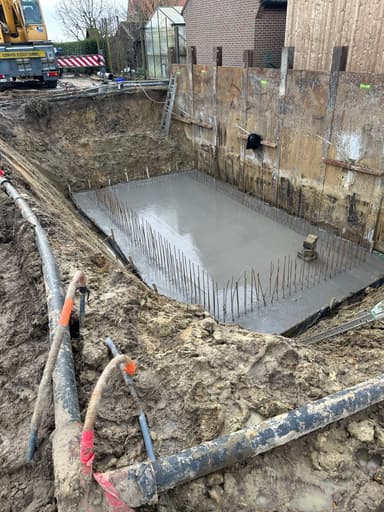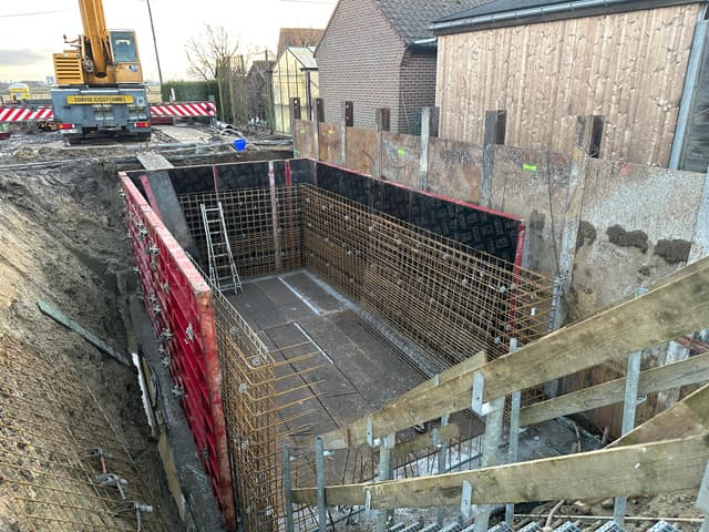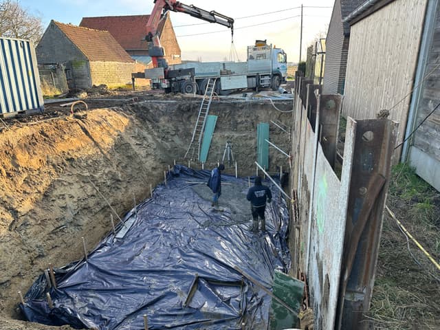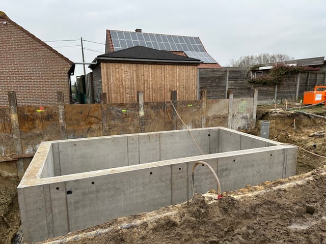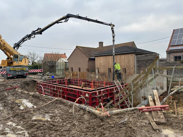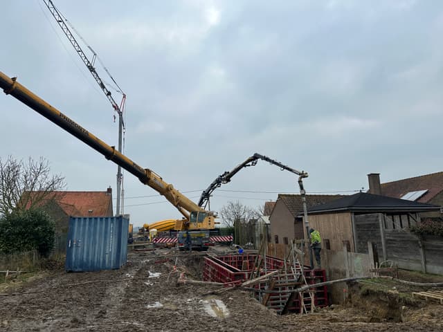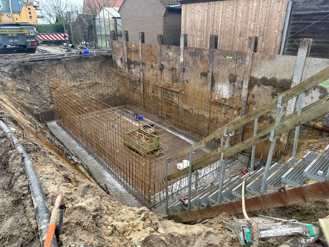 In de afgelopen weken is de kelder geplaatst door Vandaele Construct. Het waren in momenten natte omstandigheden, maar dankzij het harde werk en de doorzetting is de kelder een feit.