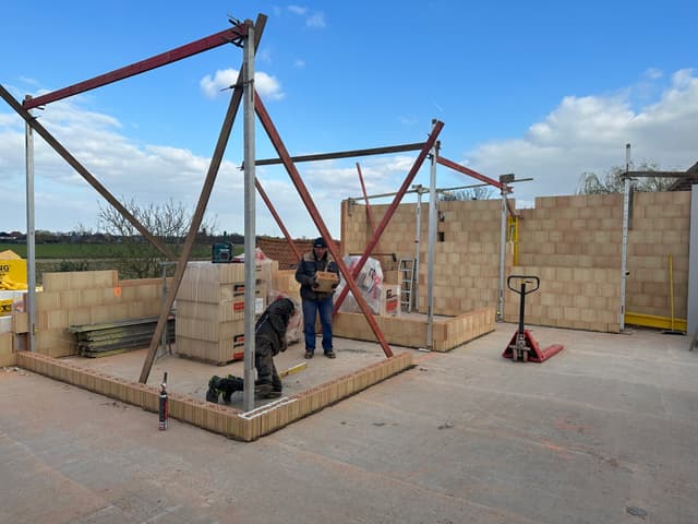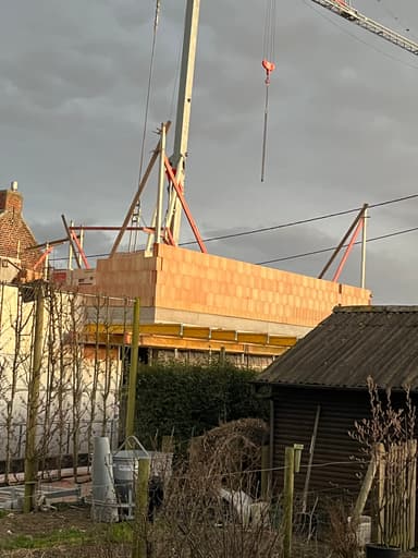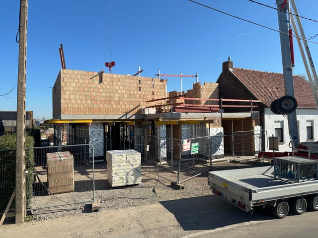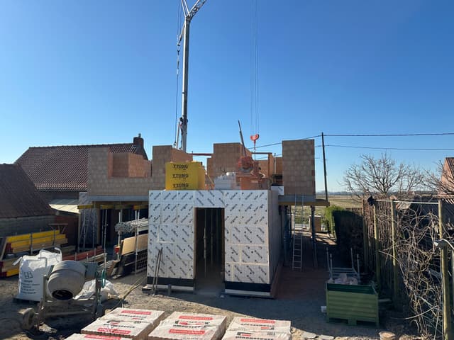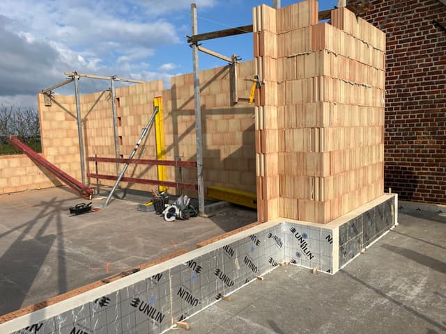 De betonplaat op het gelijkvloers is intussen gegoten en gedrogen. Nu is het tijd om de muren te beginnen metsen op het verdiep. Het verandert iedere dag!