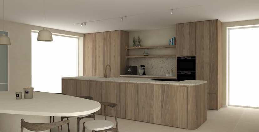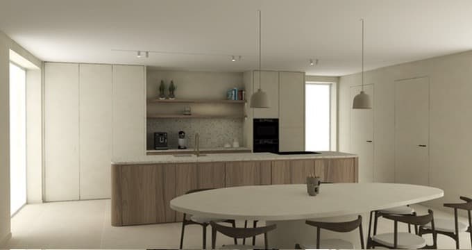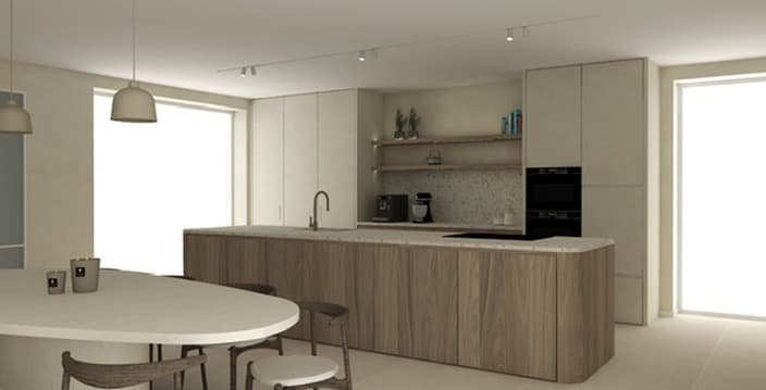 Zoals je kunt zien op de foto, hebben we van de interieurarchitect twee verschillende ontwerpen gehad voor de keuken. De ene in frozen wallnut, de andere in het wit.